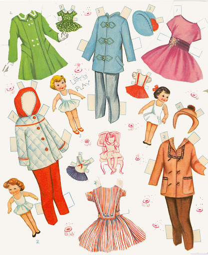 Here's another set with 3 little girls who grew and grew. This one is a little later, 1960s I think by Whitman. I really like the small illustrations on the clothing pages