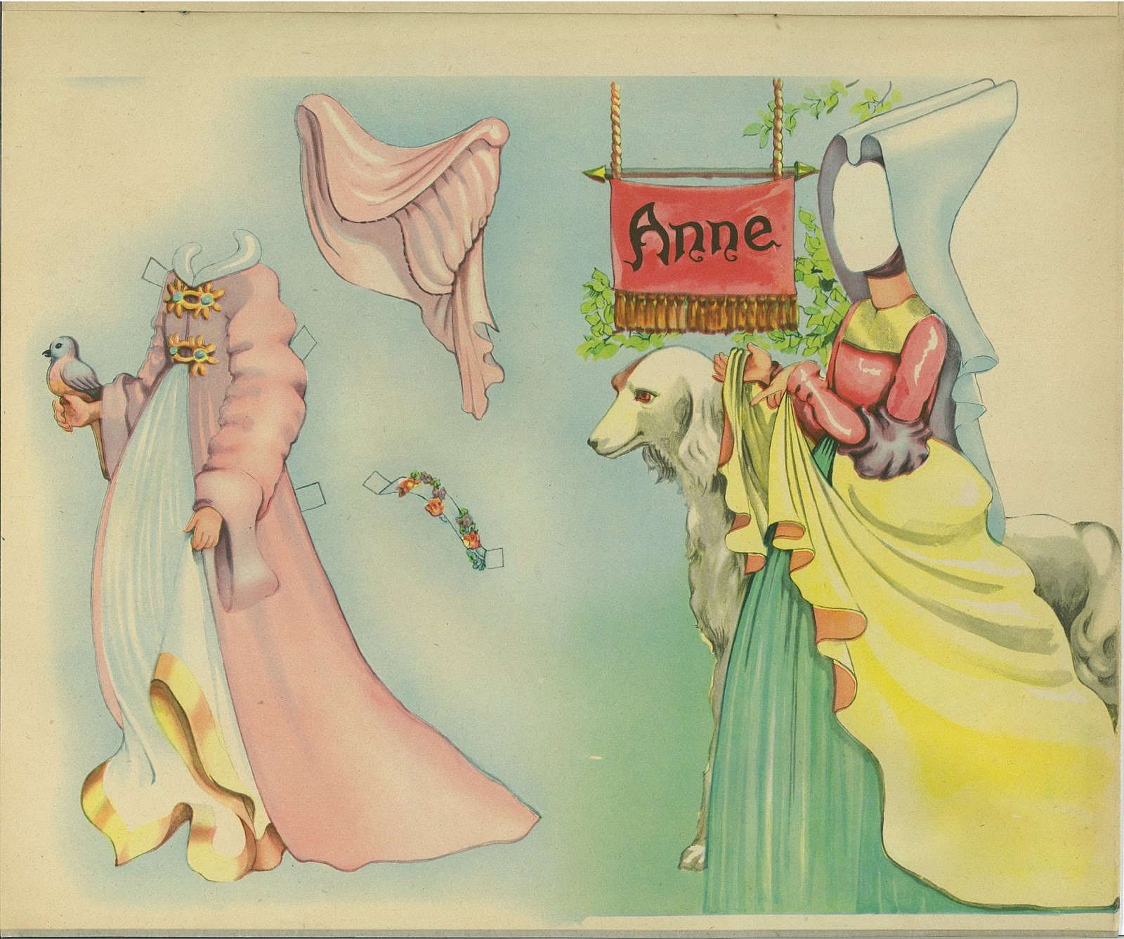 Here's a nearly complete set of Romance paper dolls by the artist Helen Page. Joan has been cut from the cover but is still here and she is missing one outfit. Other then that, everything else is intact. Prudence outfits are not shown because the digital file scan has gone missing! Her outfits remind me of pilgrims. A few of the dresses go off the page, like Anne's yellow gown, this is how the set is printed and not a scanning error. The backgrounds of this set are really lovely. These dolls were available in other sets. I do not have a date on this set but I think (based on some loose research) it is from around 1949. This set was published by Samuel Lowe. There will be no post tomorrow and perhaps none on Friday either.