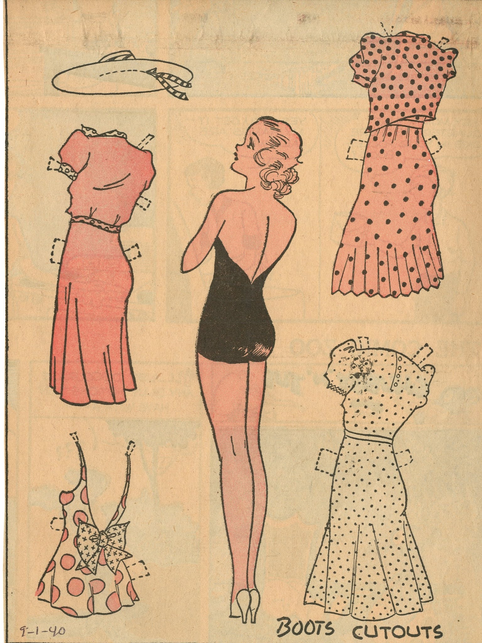 A lovely back view of boots. Again limited print color of black and red. She has four outfits and one hat. 9-1-1940 is the date